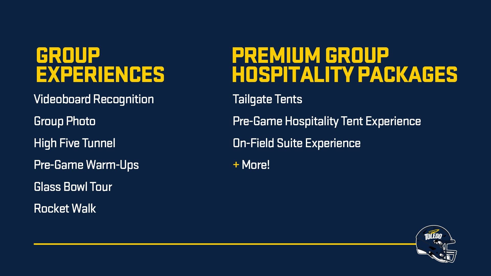 Whether you're looking to treat your employees to a day out, connect with your current or potential clients, raise money for your organization, or kick off the season with your youth sports team, the Toledo Rockets can help you plan an exciting group outing!